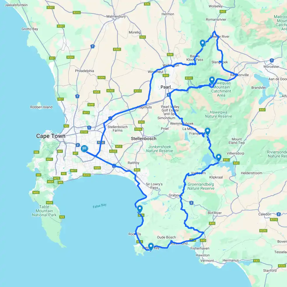 This route explores 4 beautiful mountain passes in the Cape Fold mountains and the coastal road around False Bay. Experience Bain's Kloof Pass and the winelands in Slanghoek, Du Toits Kloof pass, Franschhoek pass and the beautiful Highlands pass in the Elgin Valley.