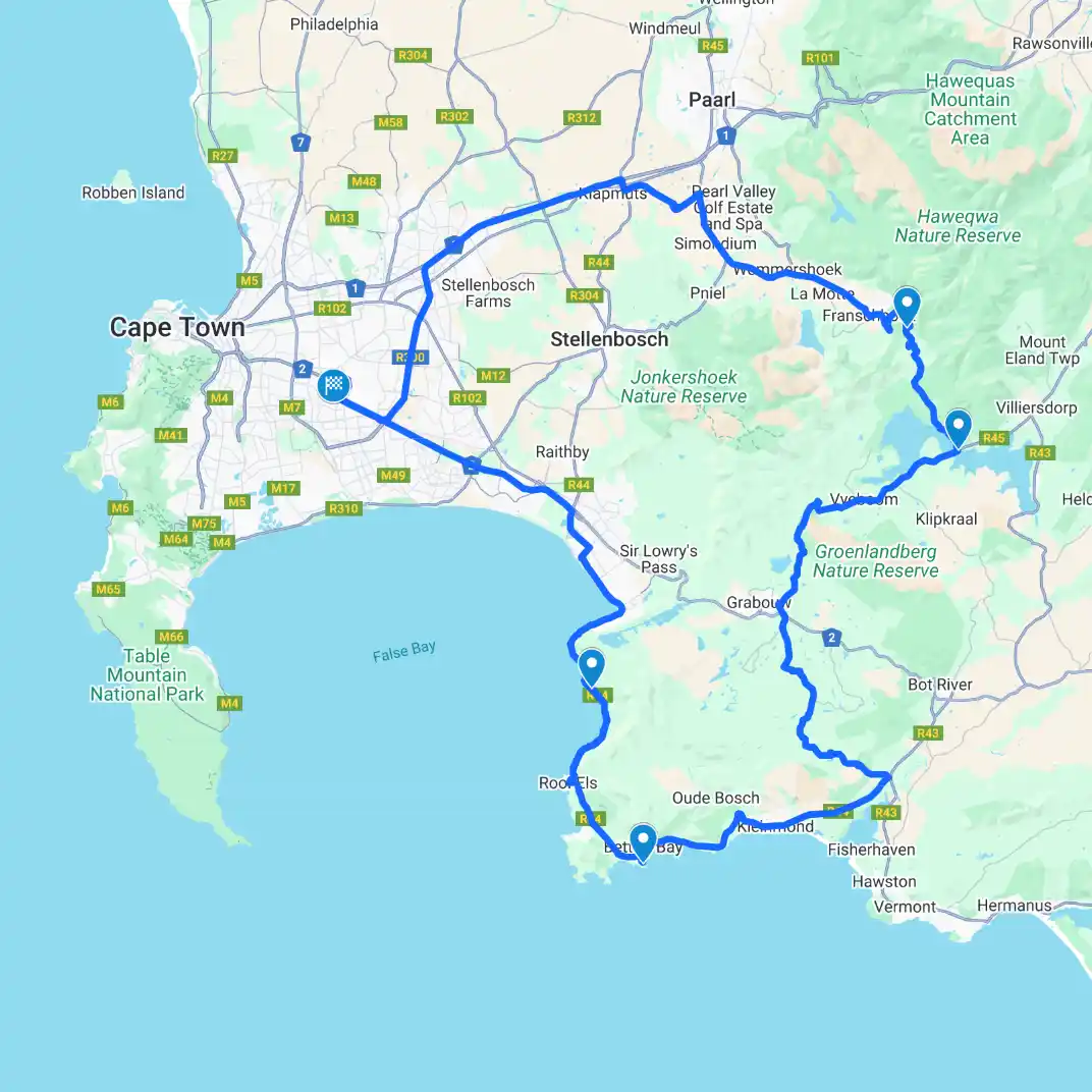 Ride the breathtaking Clarence Drive around the False Bay coast, visit the Penguins at Stoney Point, ride the twisting roads and beautiful winelands of the Elgin Valley and Franschhoek.