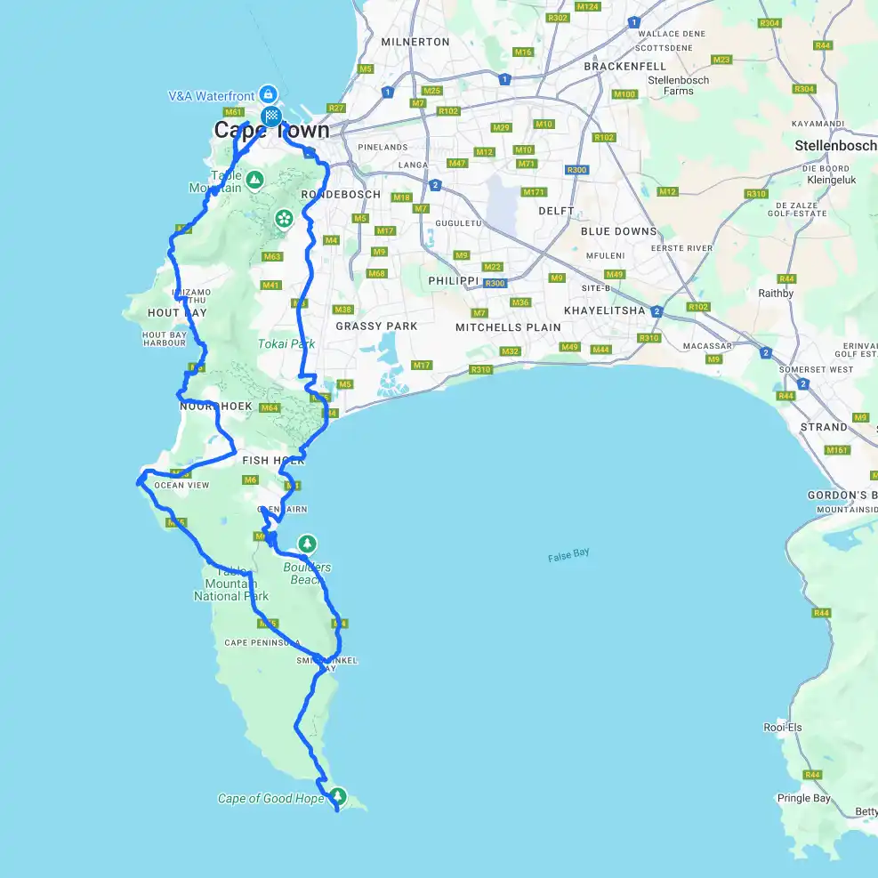 This is a beautiful, relaxed ride around the all-tar coastal roads of the Cape Peninsula. Visit the penguins at Boulders Beach, explore the Cape of Good Hope and ride the beautiful road along Misty Cliffs to Kommetjie. We end the day with a ride around Chapmans Peak drive into Hout Bay.